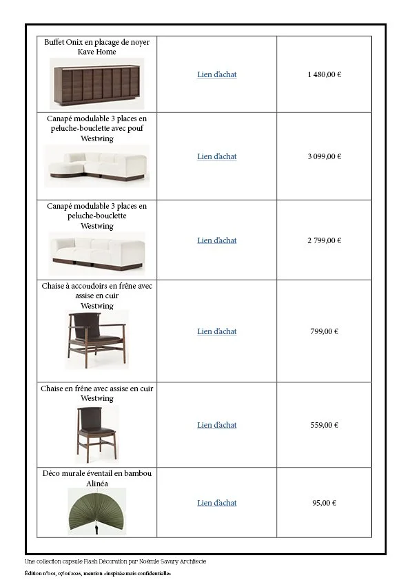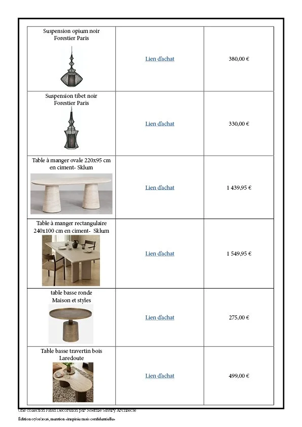 Ce qui est inclus : ✓ Échange approfondi sur vos goûts et vos usages (1h) ✓ Analyse de votre pièce et de l'existant ✓ Création d'une planche d'ambiance unique ✓ Palette de couleurs personnalisée (murs, textiles, accents) ✓ Sélection sur-mesure du mobilier, luminaires et accessoires ✓ Plan d'implantation optimisé ✓ Shopping list détaillée avec références et liens d'achat ✓ Présentation du projet en visio (30 min) ✓ 1 aller-retour d'ajustements inclus.